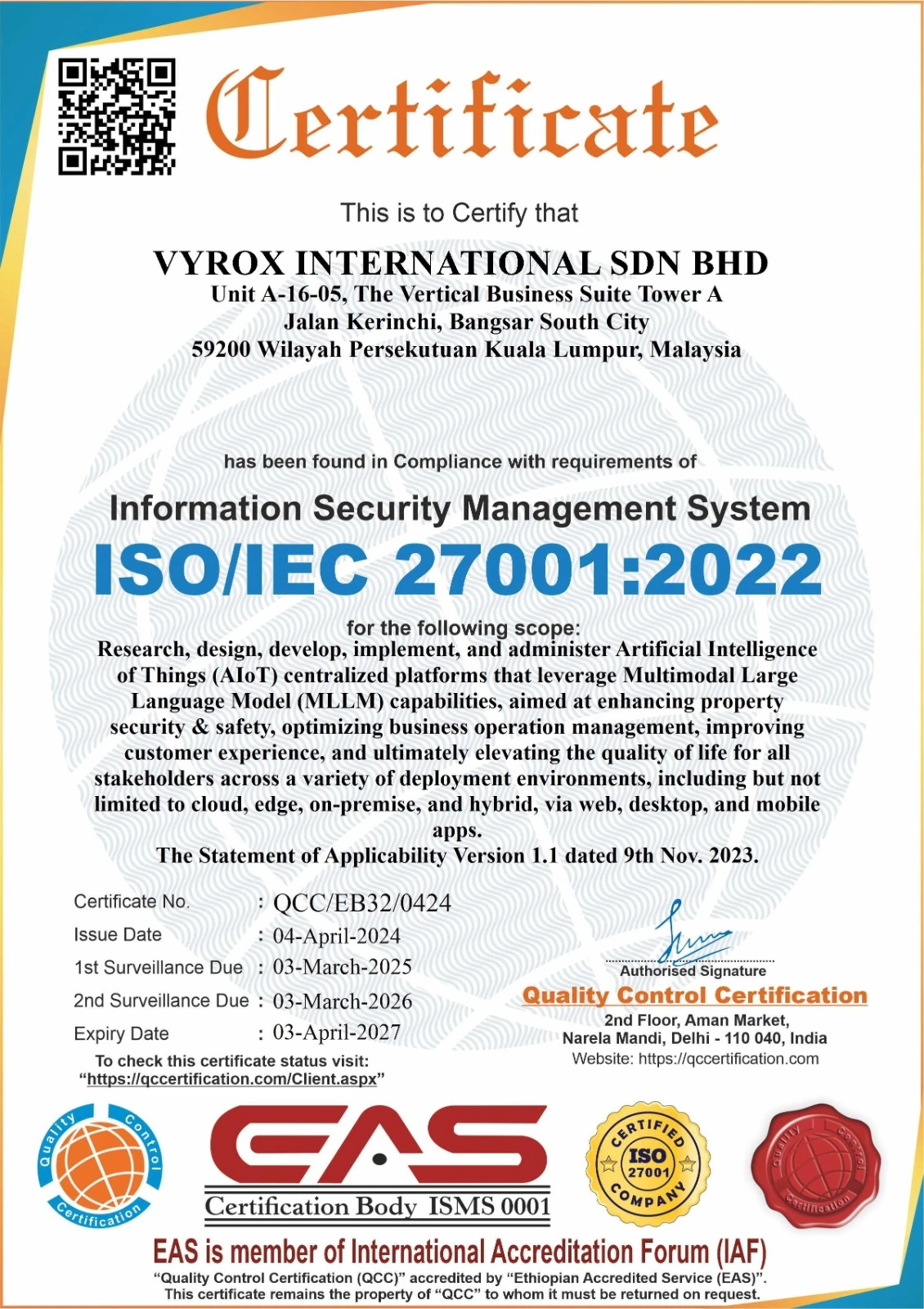VYROX achieved ISO 27001 certification for its VYROX Very Intelligent Platform (VIP) software system, demonstrating its commitment to ensuring the highest standards of information security. This certification reinforces VYROX's dedication to maintaining the confidentiality, integrity, and availability of information within its smart community and property management systems, critical to safeguarding client and user data in high-security environments.