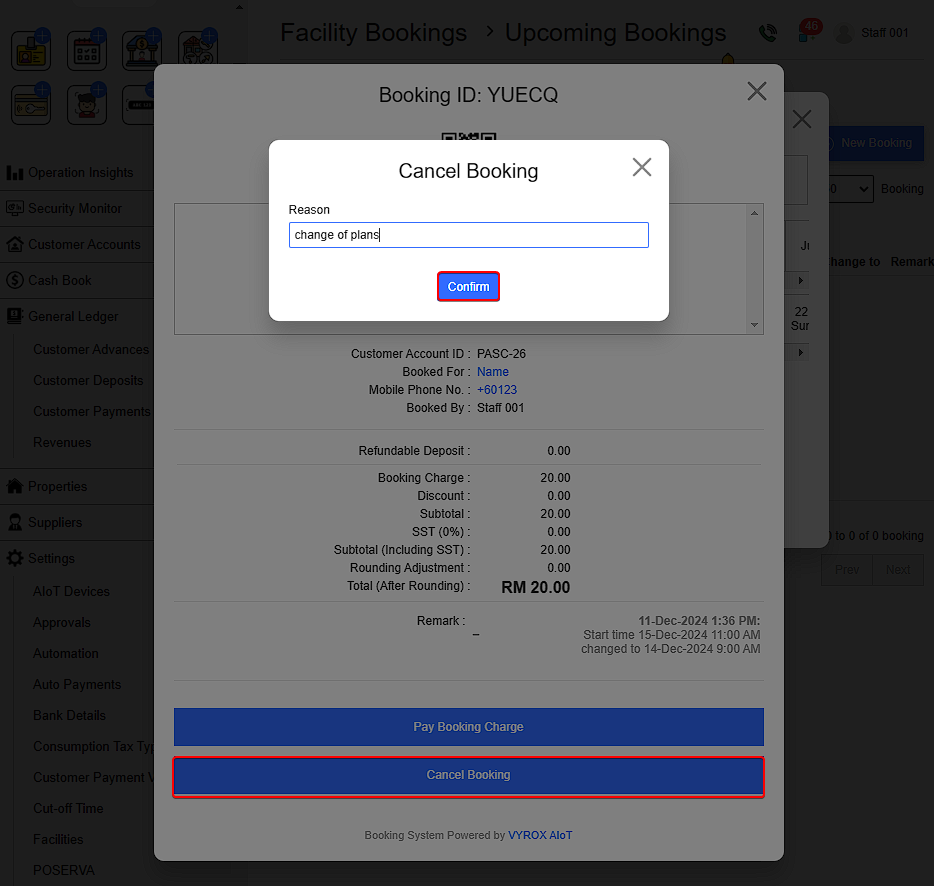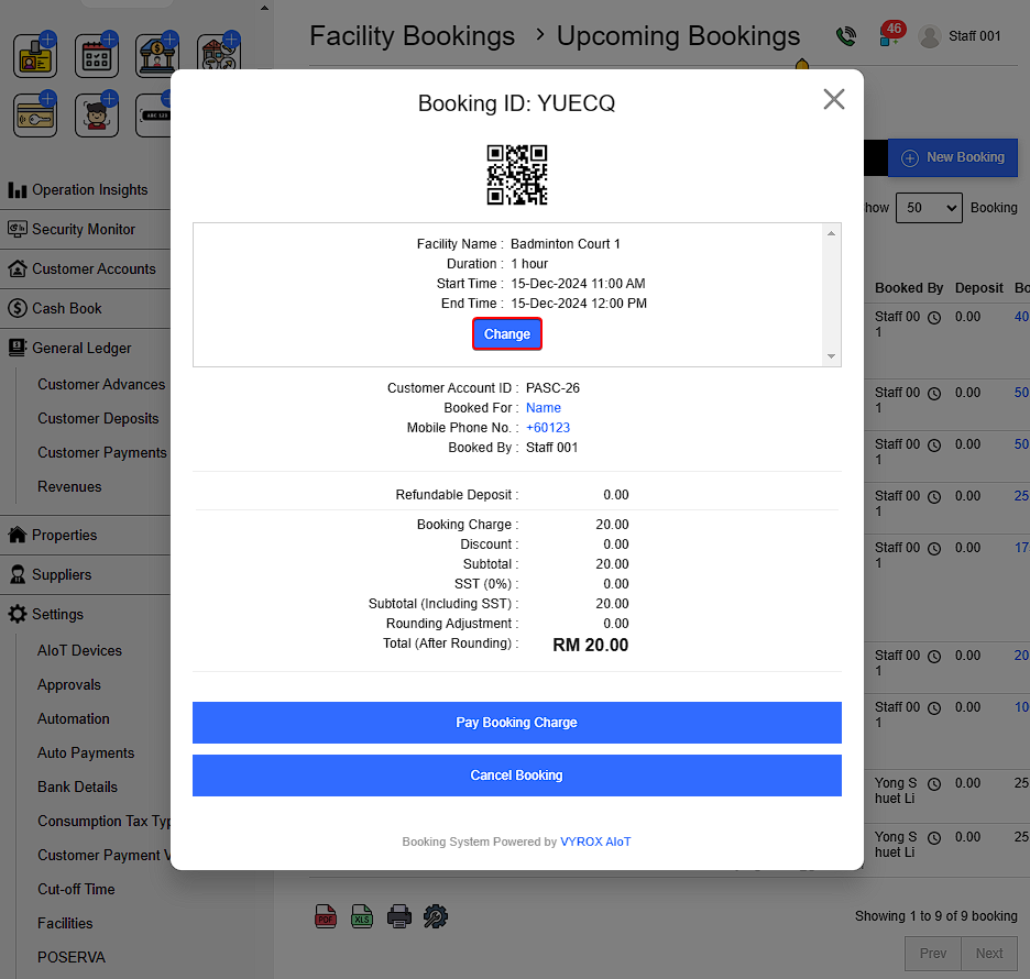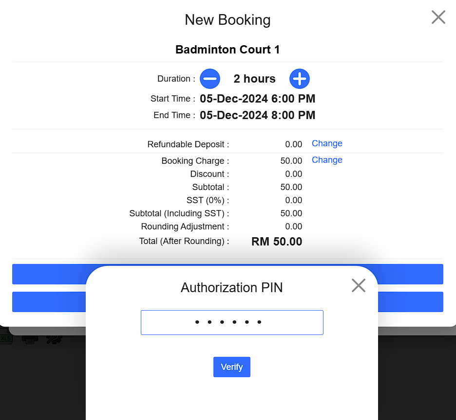 To change the refundable deposit or booking charges,Click Change > Enter the final charges > Enter authorization PIN > Verify to complete the process.