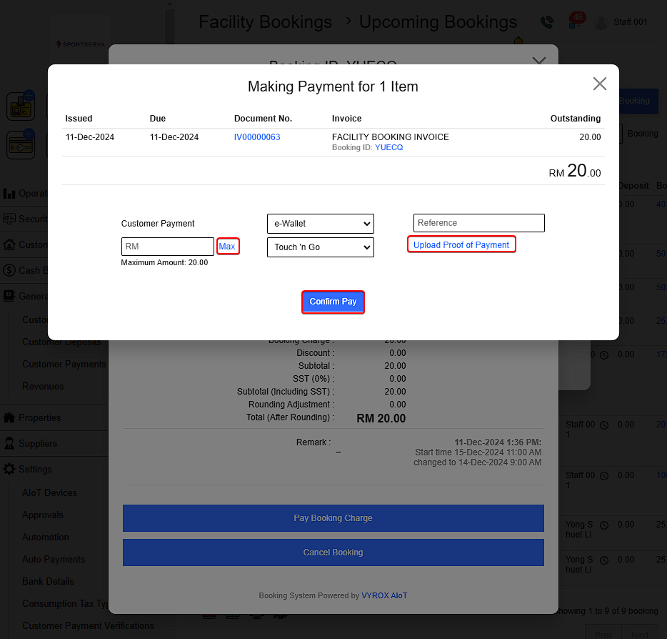 Click Max for customer to pay maximum amount of charged booking