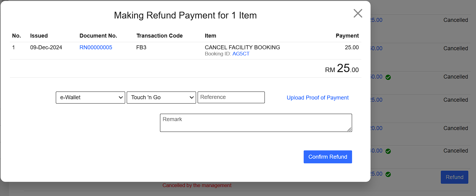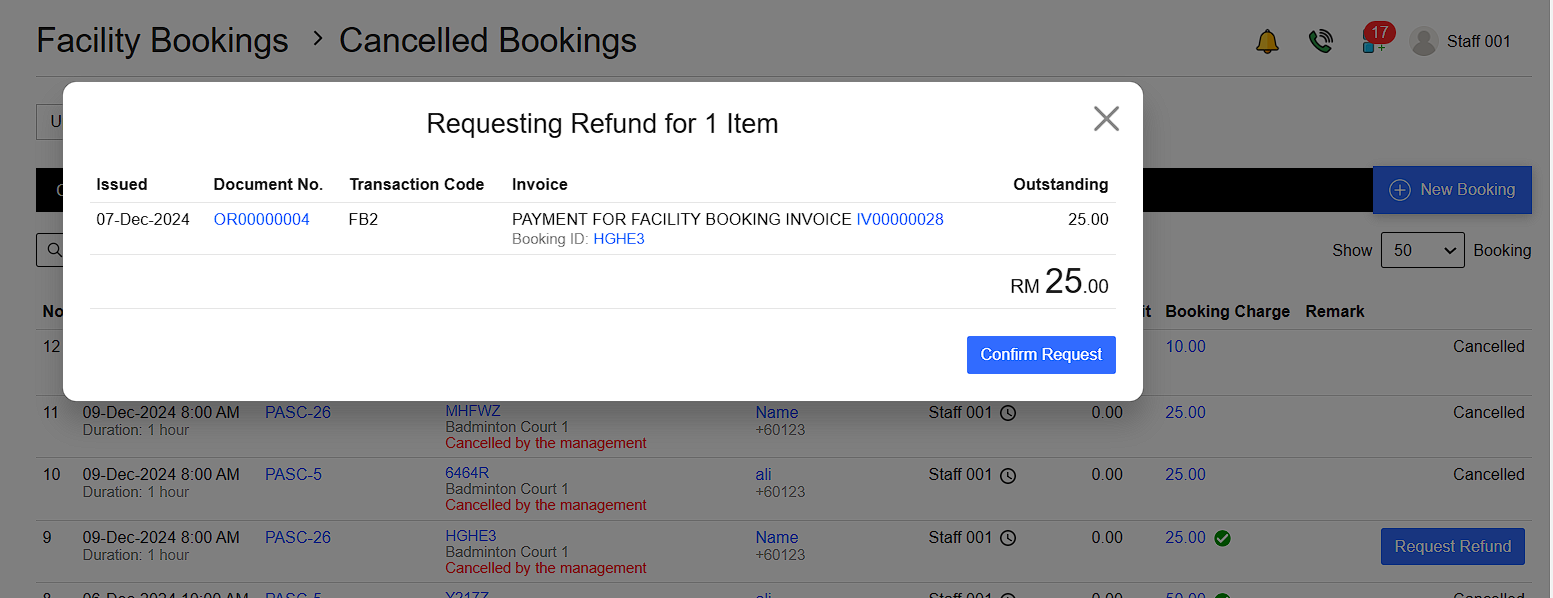 Navigate to Facility Booking > Cancelled > Request Refund > Confirm Request > Refund > Confirm Refund.