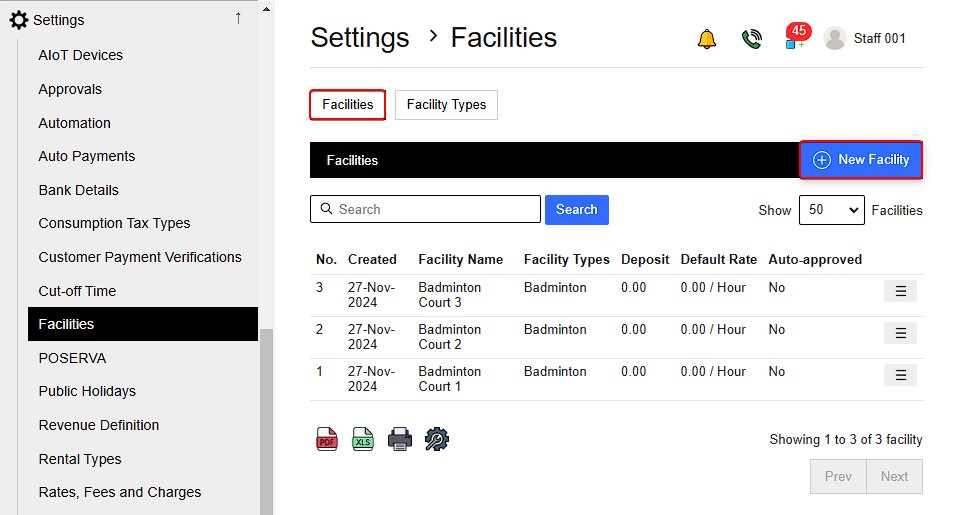 On the left-side menu, go to Settings > Facilities.