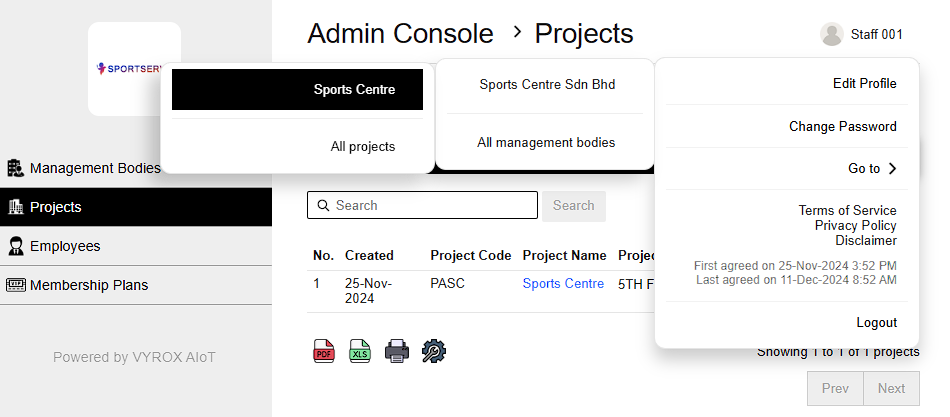 At the top-right corner of the webpage, Go to the profile icon > Go to > SPORTS CENTRE SDN.BHD. > Sports Center