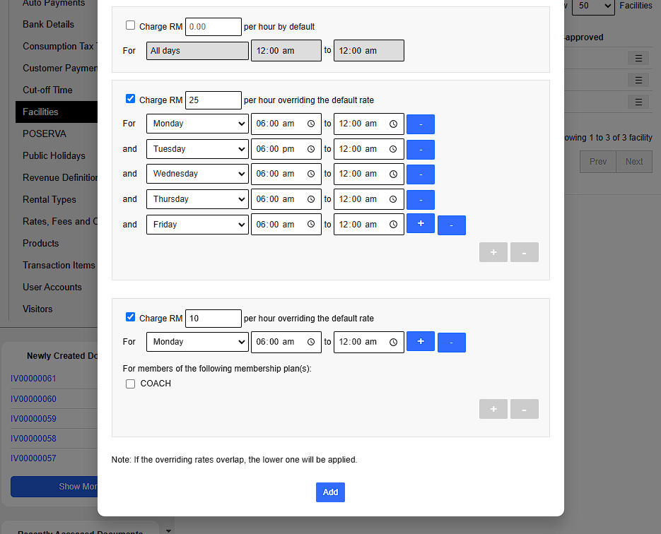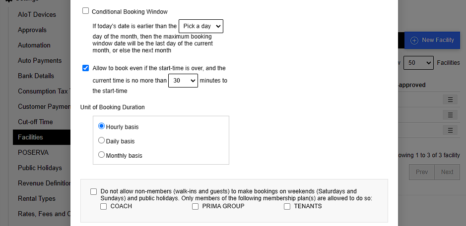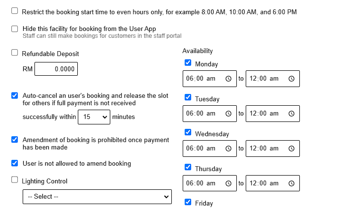 • Management can define the days (e.g., Monday to Friday) and operating hours for the facility's availability.