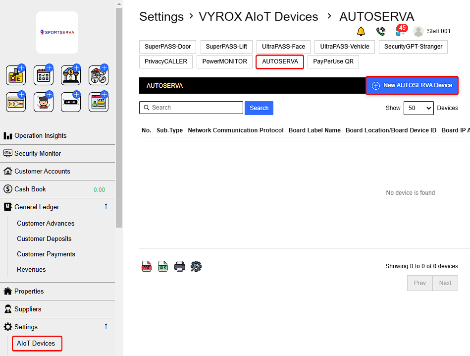 Go to Settings > VYROX AIot Devices > AUTOSERVA > New AUTOSERVA Device
