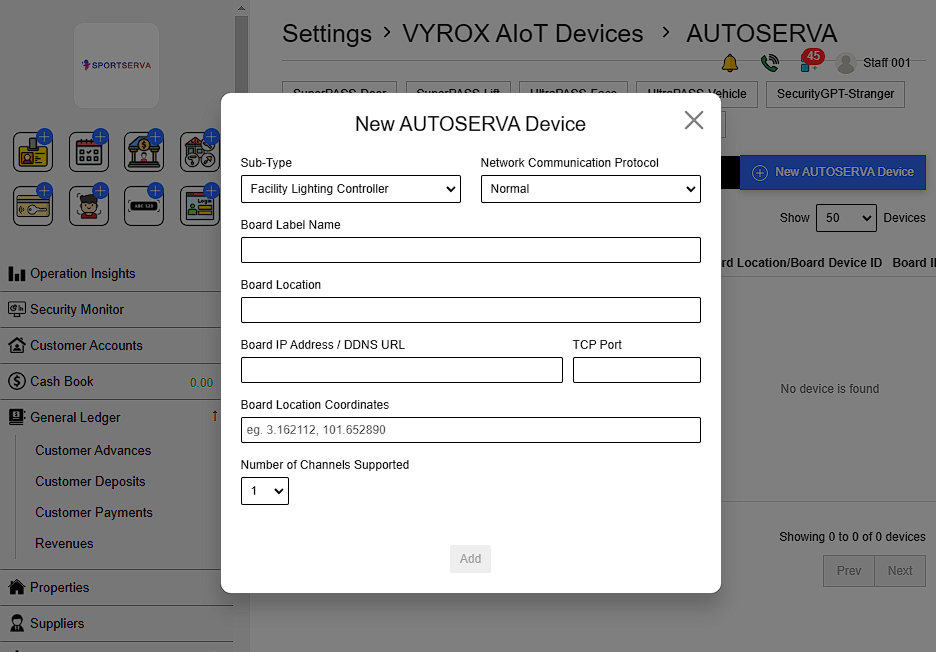 Fill in details such as Sub-Type, Network Communication Protocol ,Board Label Name, Board Location, Board IP Address / DDNS URL,TCP Port , Board Location Coordinates and Number of Channels Supported. Click add when finish.