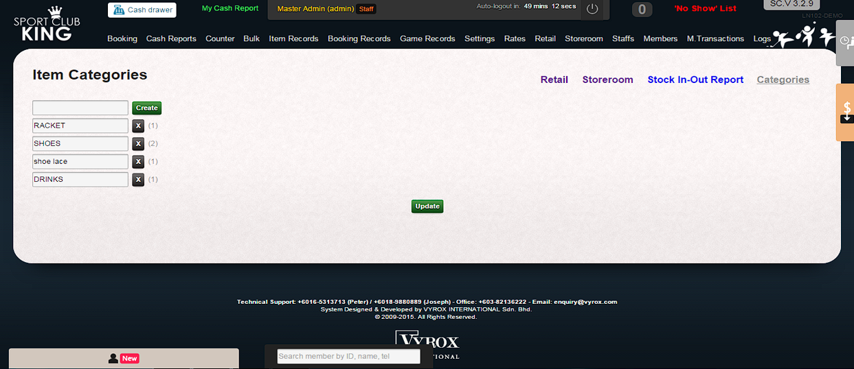 Read this chapter to learn how to set up Inventory Management and POS system. 1. Go to “Storeroom” page and Click on “Categories” Enter inventory item category name. Click “Create” to complete the process.