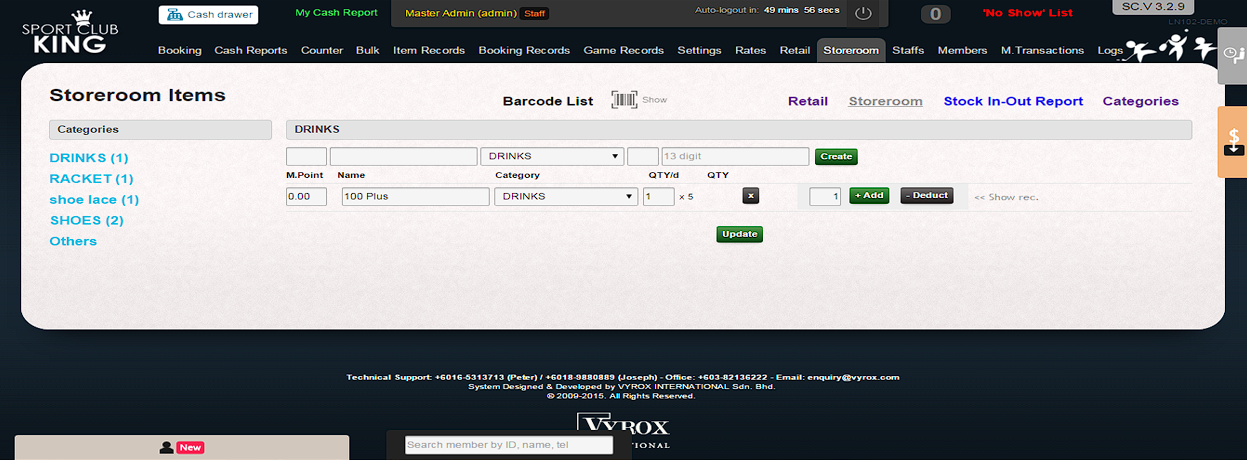 2. Go to “Store room”, Enter item name, Select Category, Enter Quantity, Click “Create” to add item.