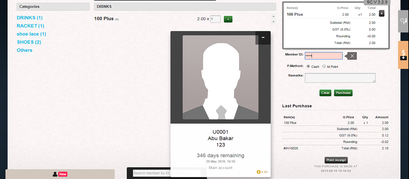 4. Go to Counter, Press “ + ” to add on the item. Scan the membership card at Member ID column. Then, member can purchase item with discounted rate.