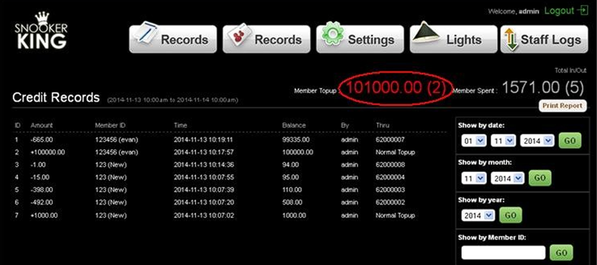 - Click “Records” icon to check total or each of member top up and member spent.