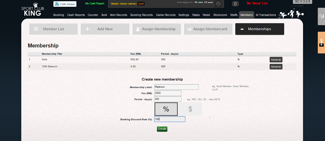 2. Fill in “Membership Label”, “Fee”, “Membership period –days”, “Booking Discount Rate (%)” and “Item Discount Rate (%)”. For example: If your membership fee is RM 1200/year, then, you can enter membership name and fee as the membership label, membership period is 365 days and Fee is RM 1200.