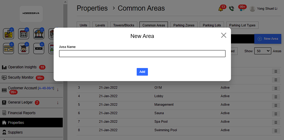 Go to Properties > Common Areas > New Common Area > Fill in details