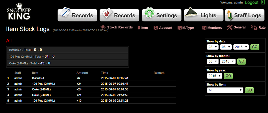 Search Item Stock Logs by date, month, year, or item.