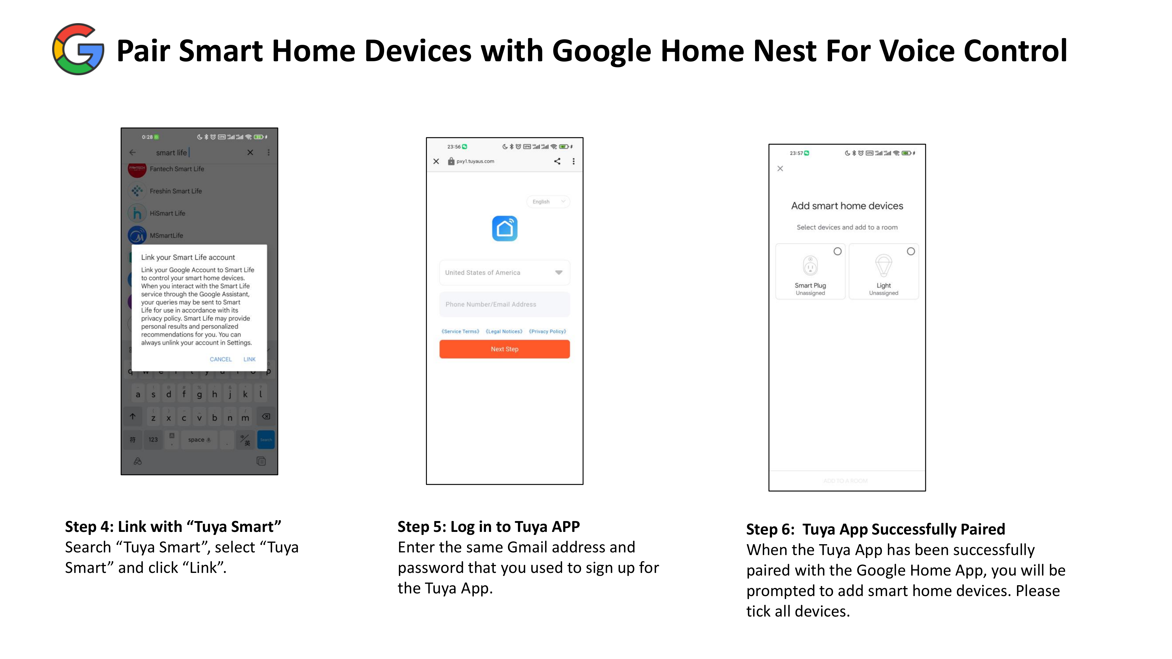 Go to Tuya > Click “+” at home page > Add devices