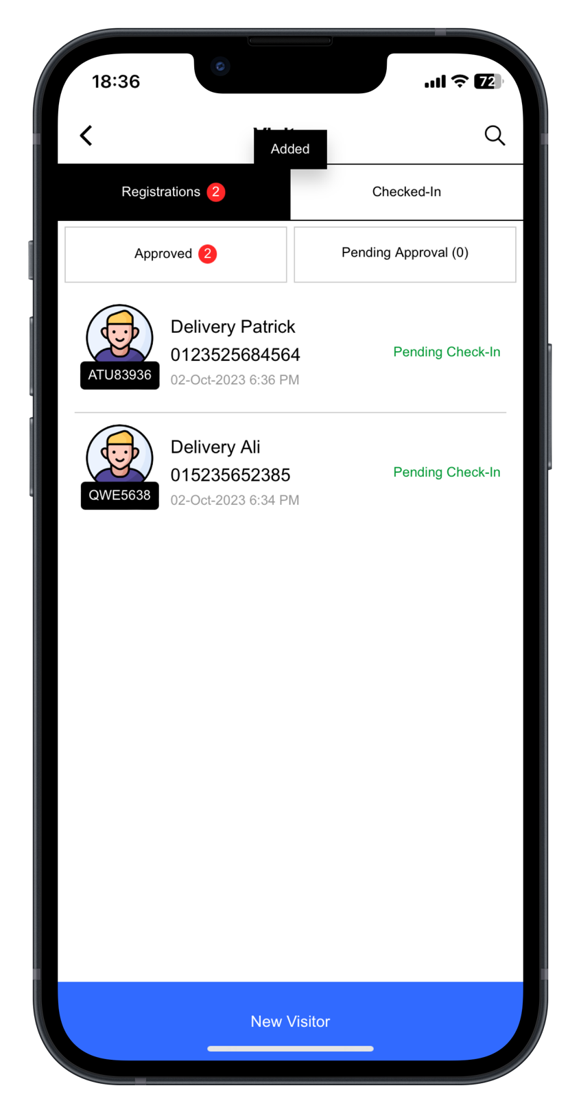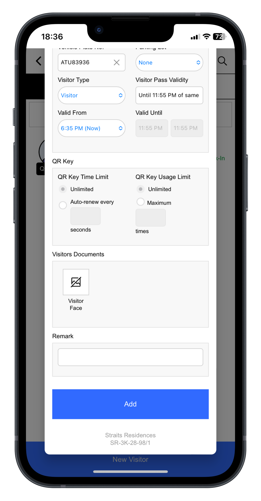Fill in appointment date, visitor name, mobile phone no. and vehicle plate number. Click ”Add” to complete the
