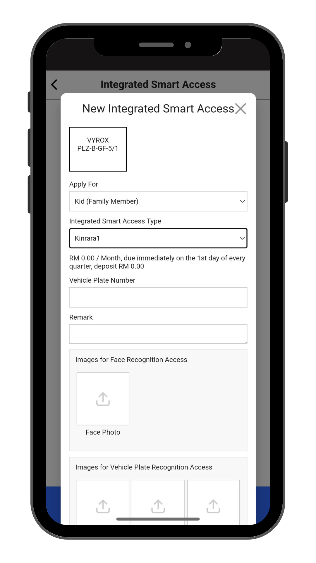 Select Apply for , Integrated Smart Access Type ,Vehicle Plate Number , Remarks and include Pictures for Facial Recognition Access , Vehicle Plate Recognition and Relevant documents.