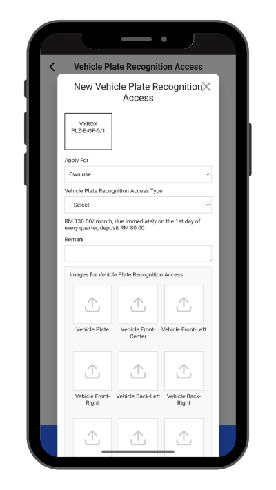 Select Apply for , Vehicle Plate Recognition Access Type, Remark, and include pictures of Vehicle Plate , Vehicle Images and Driving License.